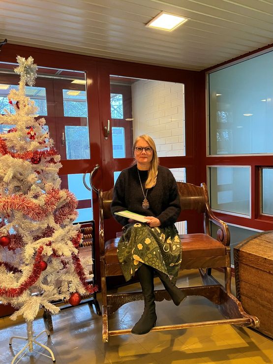 KUVA Toimitusjohtaja Mia Sarpolahti keinussa, joka perimätiedon mukaan on kuulunut Bovallius-säätiön perustajille, Sofia ja Angelique Bovalliukselle.